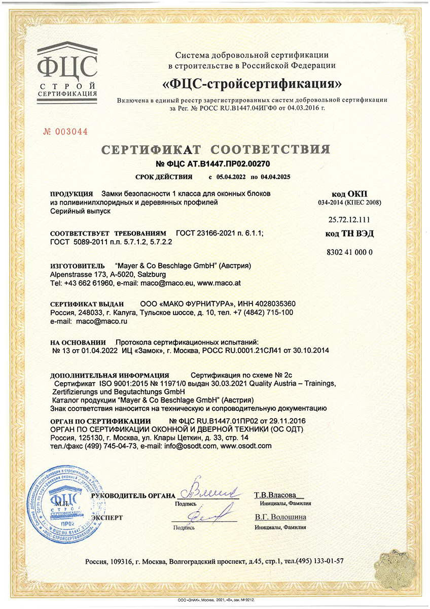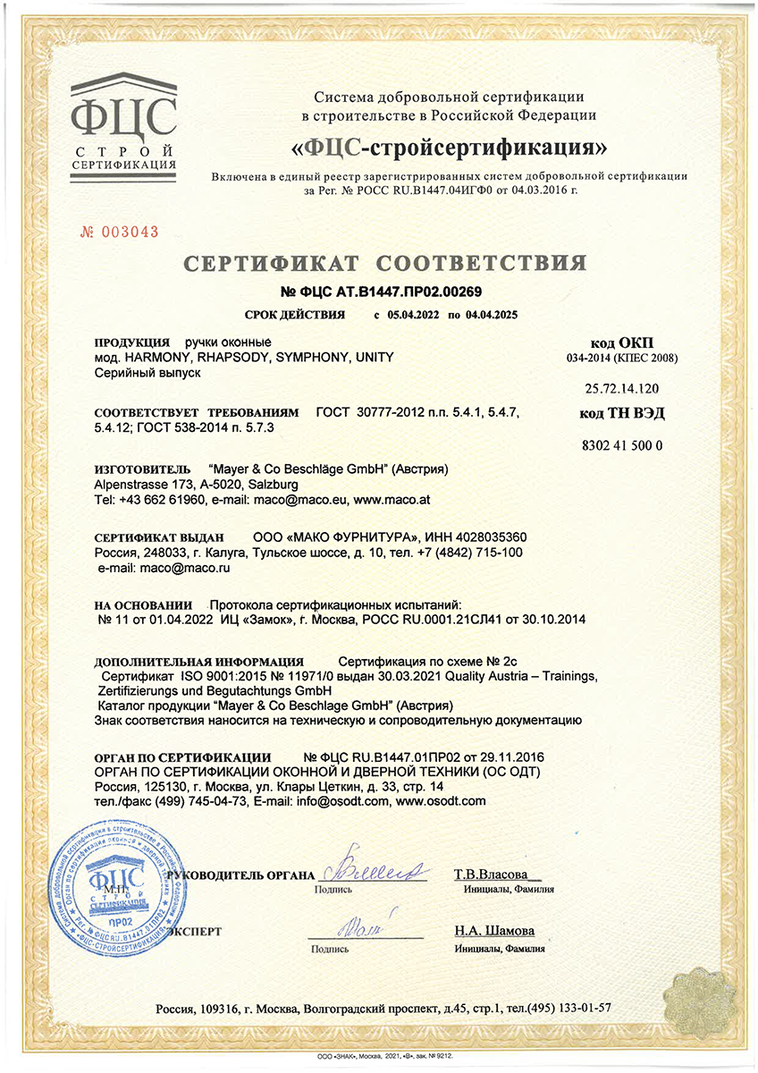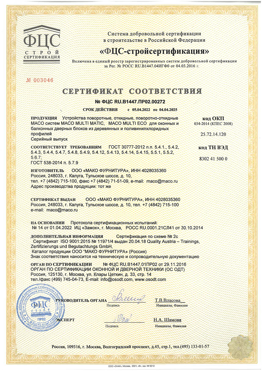 Сертификаты о соответствии MACO