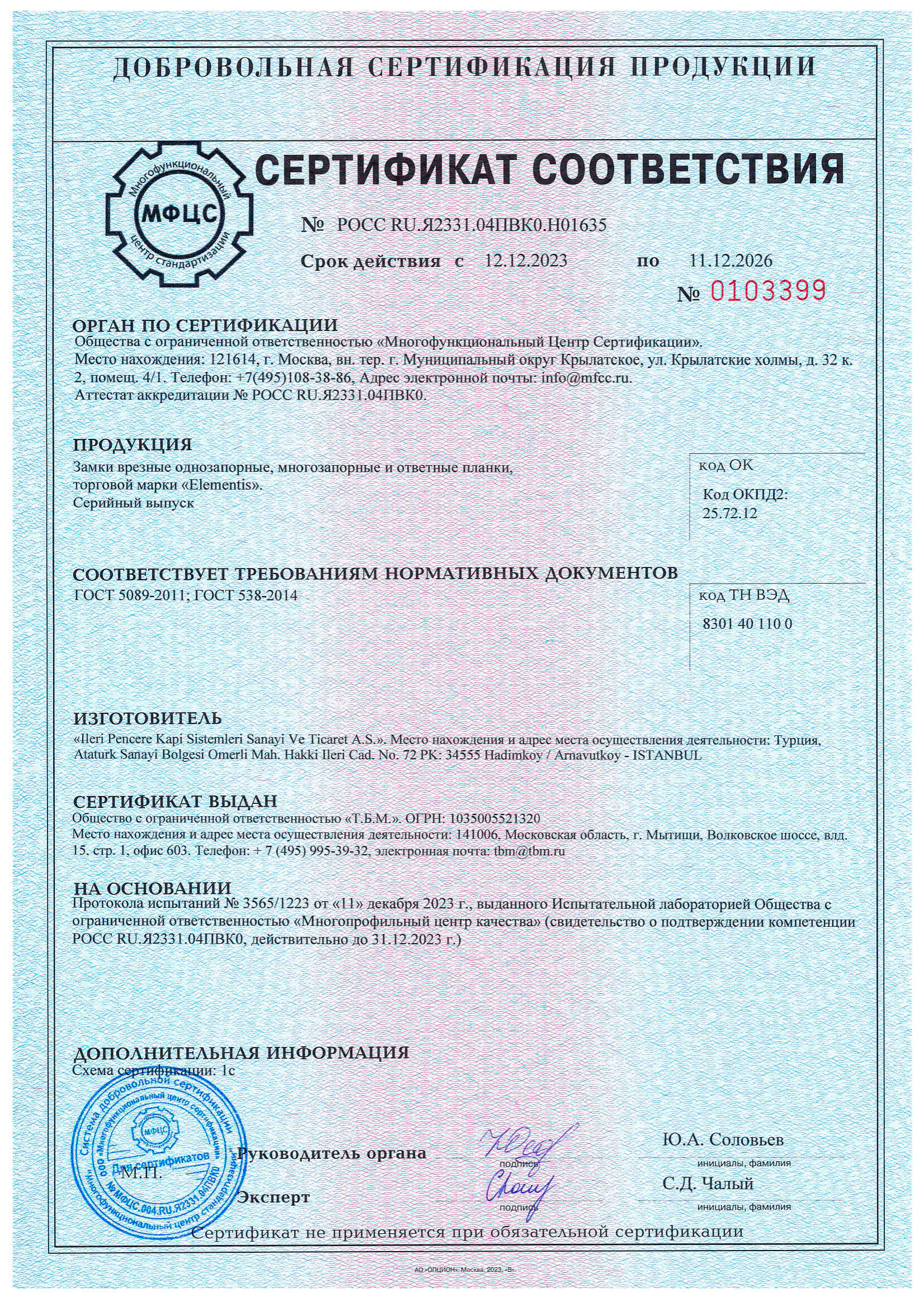 Сертификат о соответствии Elementis