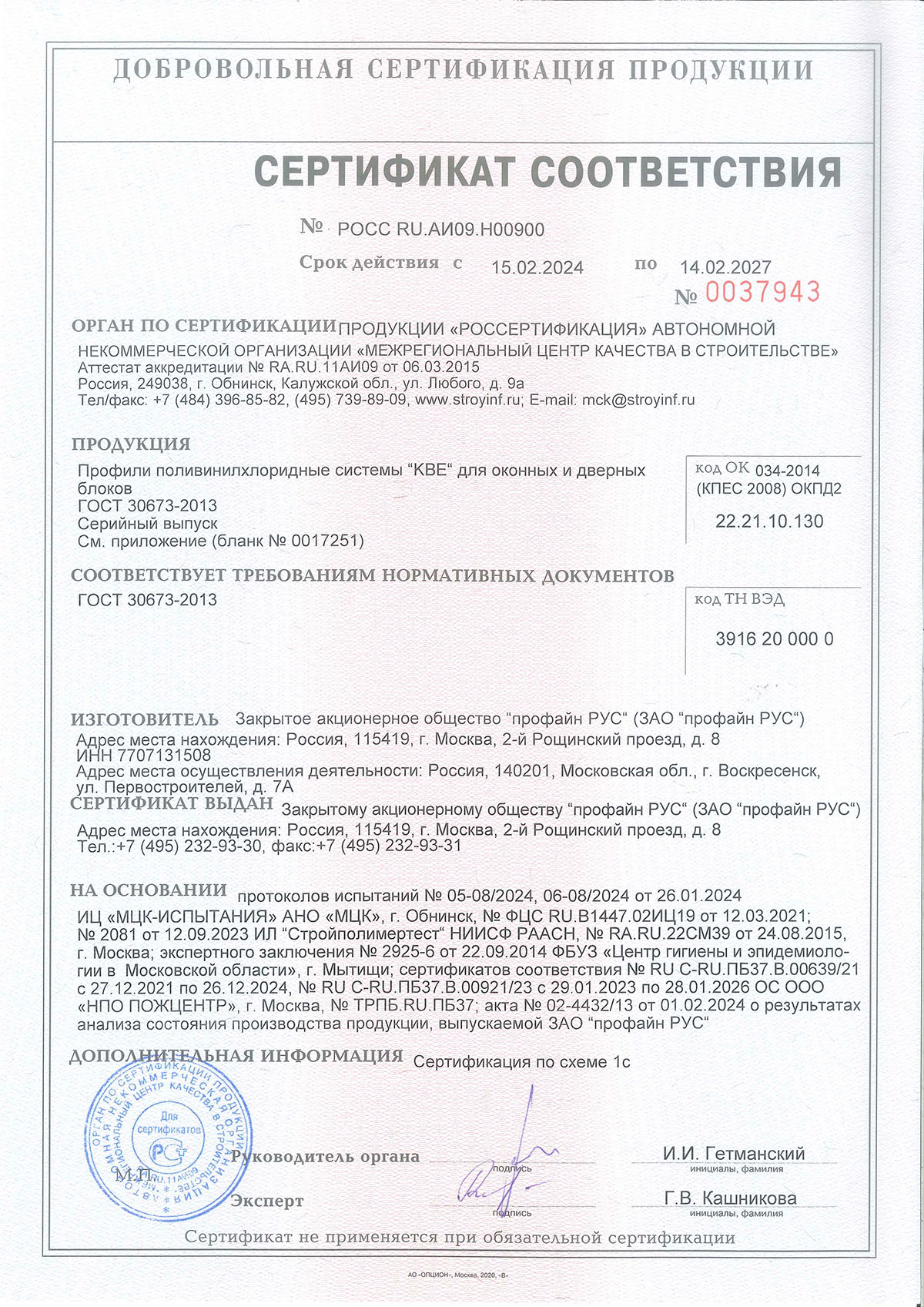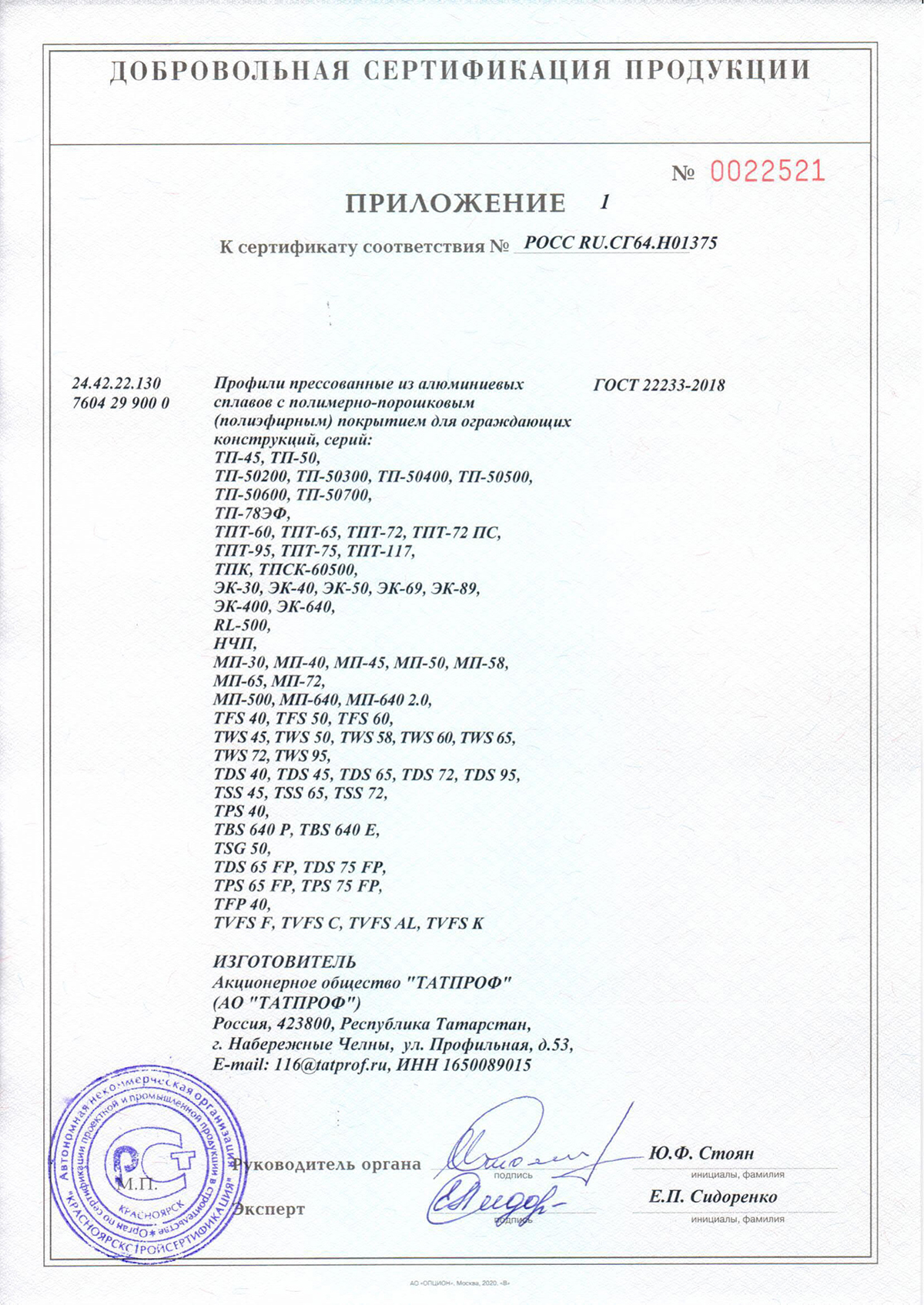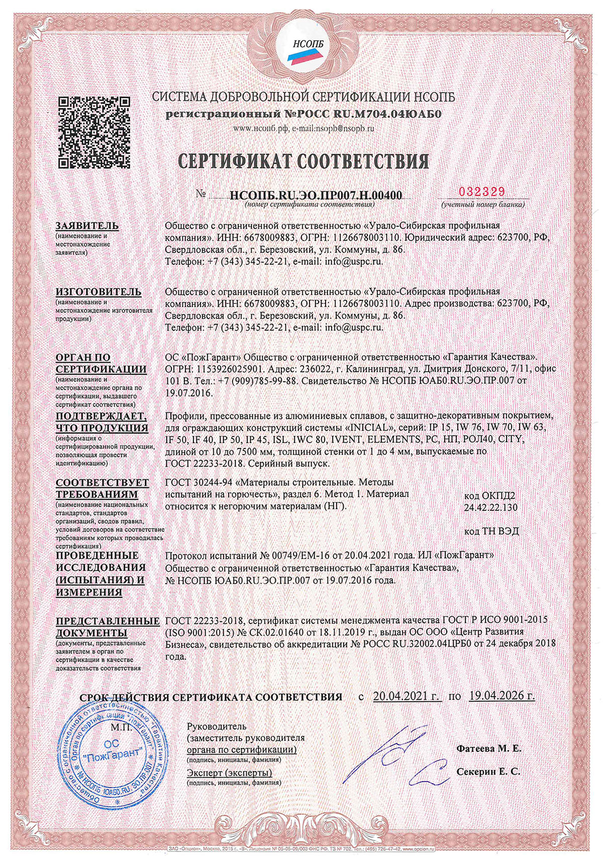 Сертификат о соответствии алюминиевых систем