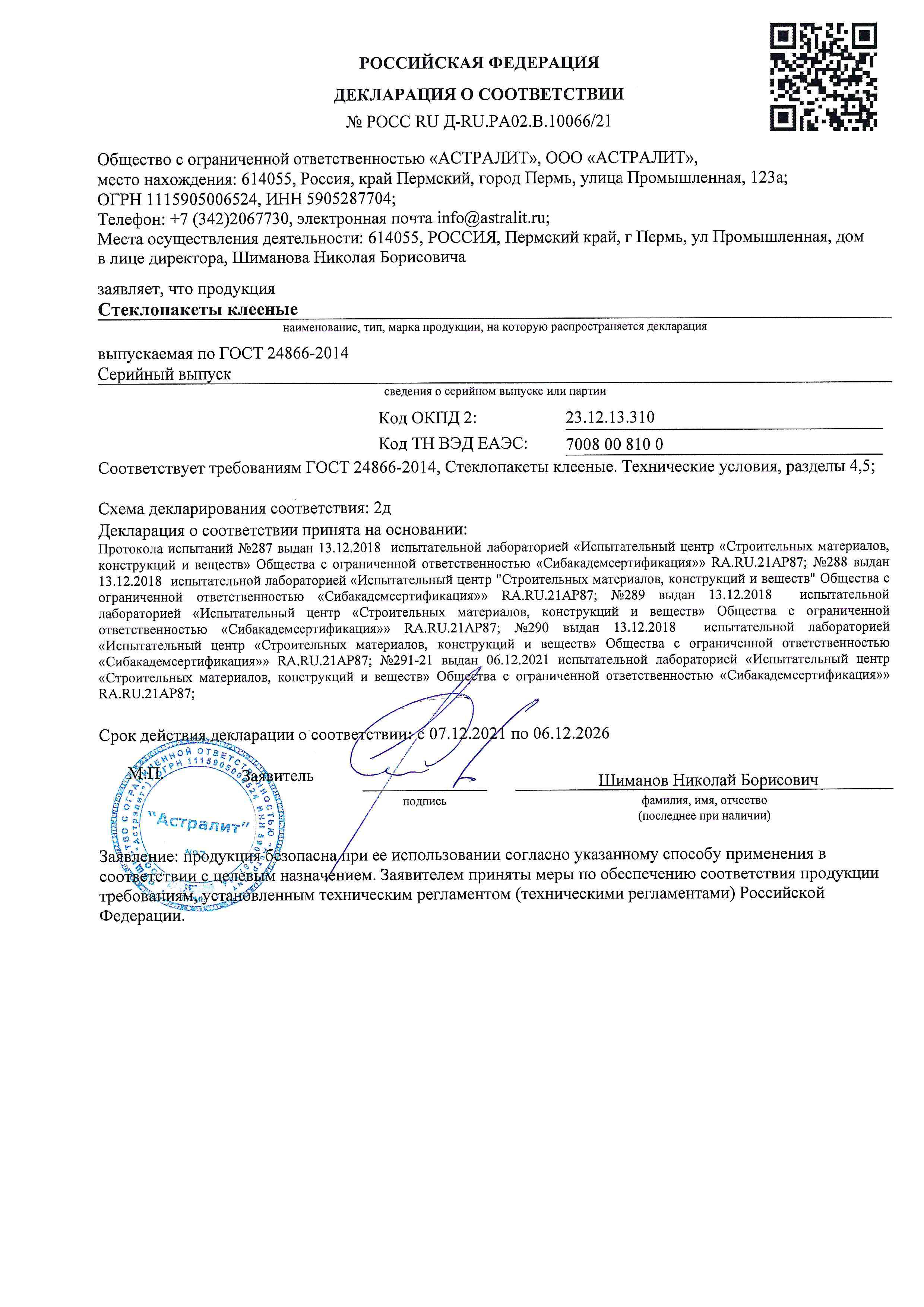 Сертификат соответствия стеклопакетов Астралит